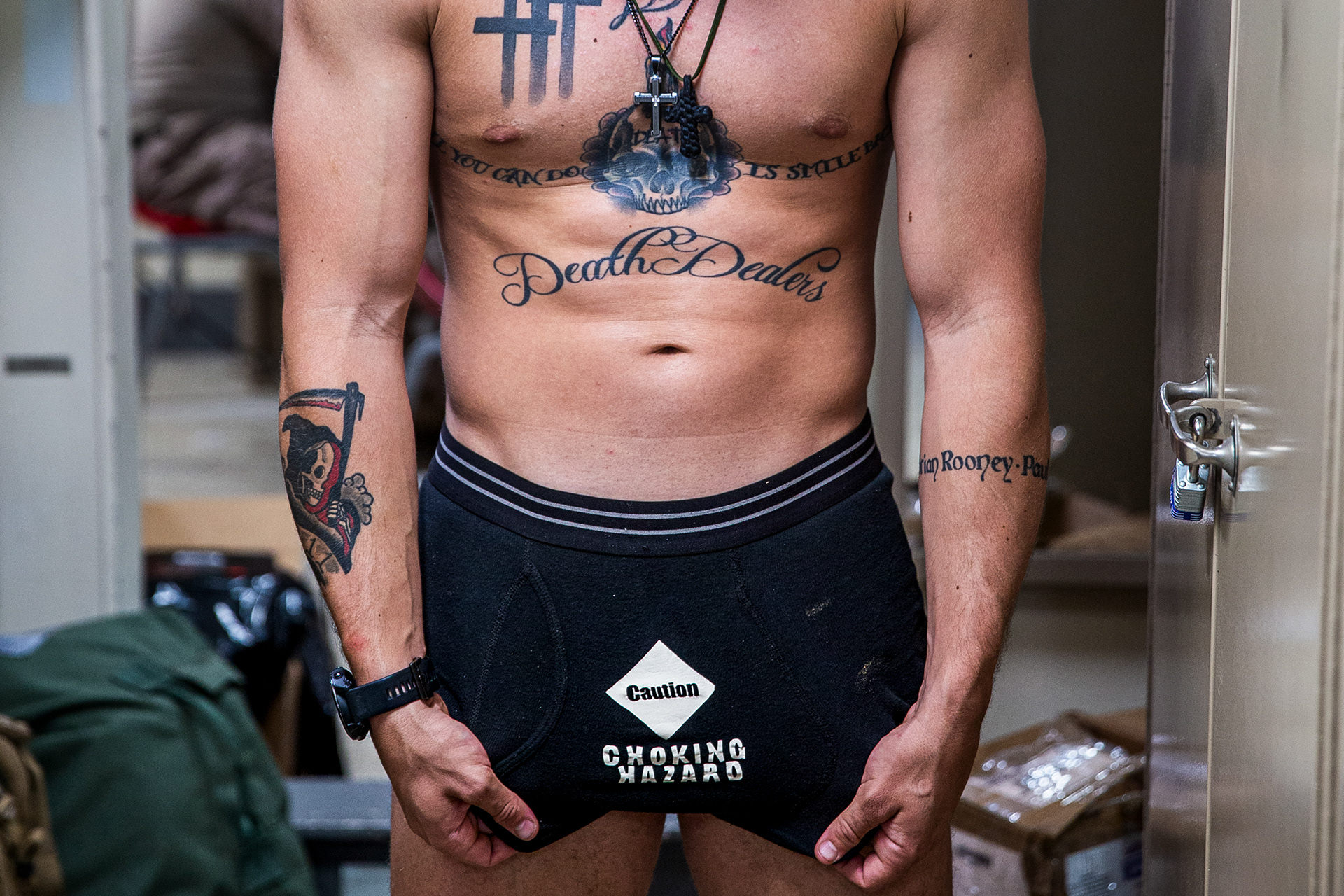 U.S. Marine Corps Sgt. John Rooney shows off his favorite pair of underwear while aboard the USS Somerset (LPD-25) in the Persian Gulf in March 2021. After spending the previous six months at sea, boundaries in the living spaces had completely eroded.