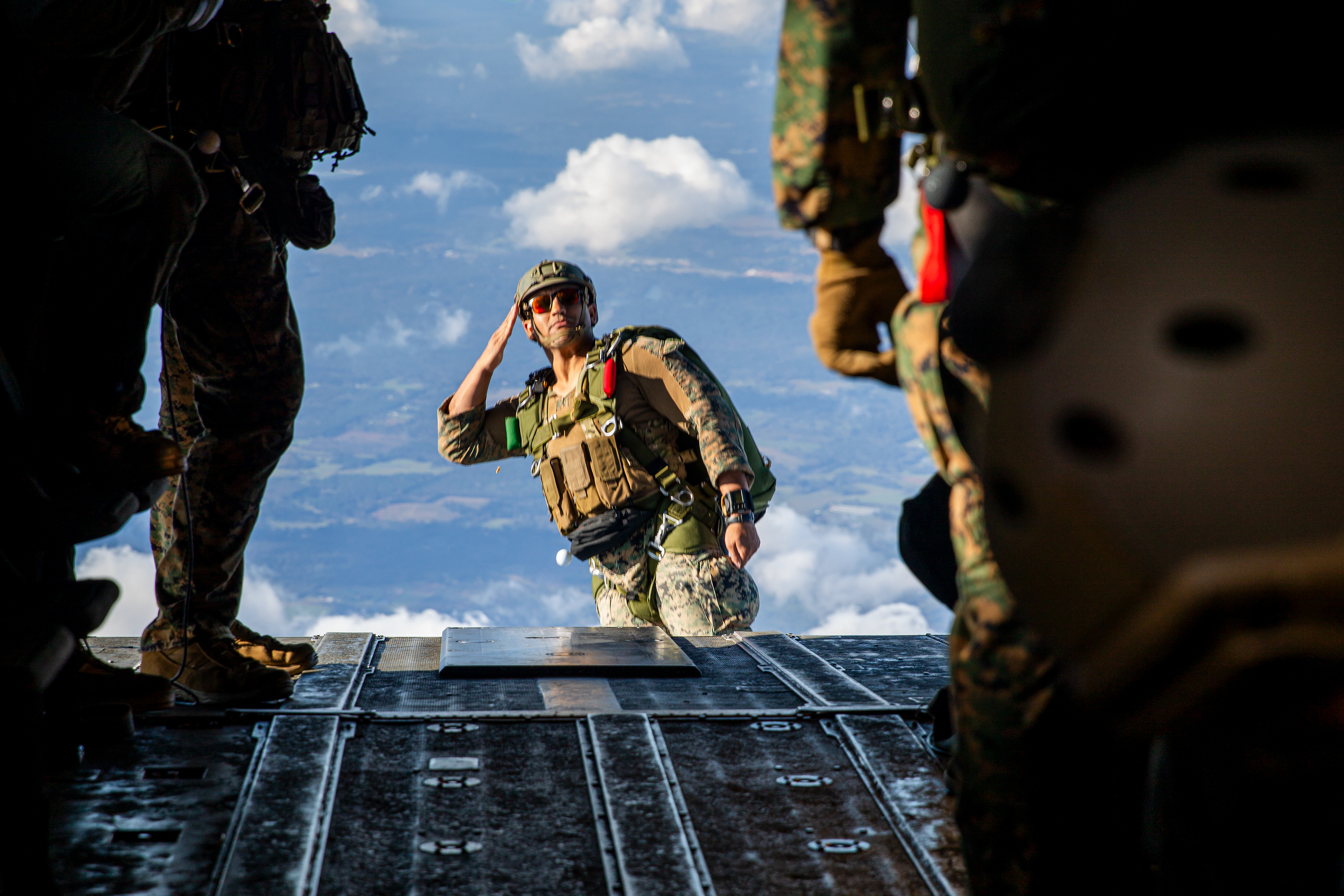 U.S. Marine Corps Staff Sgt. Andrew Rodriguez salutes as he jumps out of the back of a CH-53E Super Stallion helicopter over Hattiesburg, Mississippi in October 2021. Reconnaissance Marines like Rodriguez are required to maintain training qualifications for a myriad of disciplines including skydiving and scuba diving.