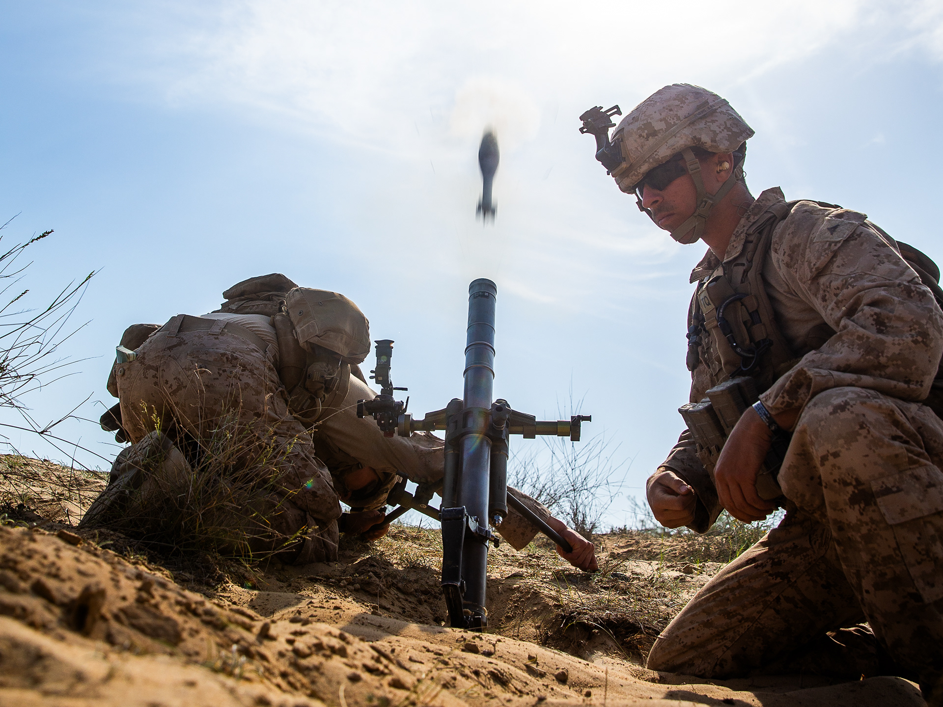 U.S. Marine Corps Lance Cpl. Chris Hill fires a 60mm mortar during a training exercise in Saudi Arabia on Feb. 17, 2021. Often carried by the lowest ranking member of the squad, the heavy 60mm mortar tubes are an invaluable asset to a company of Marines.