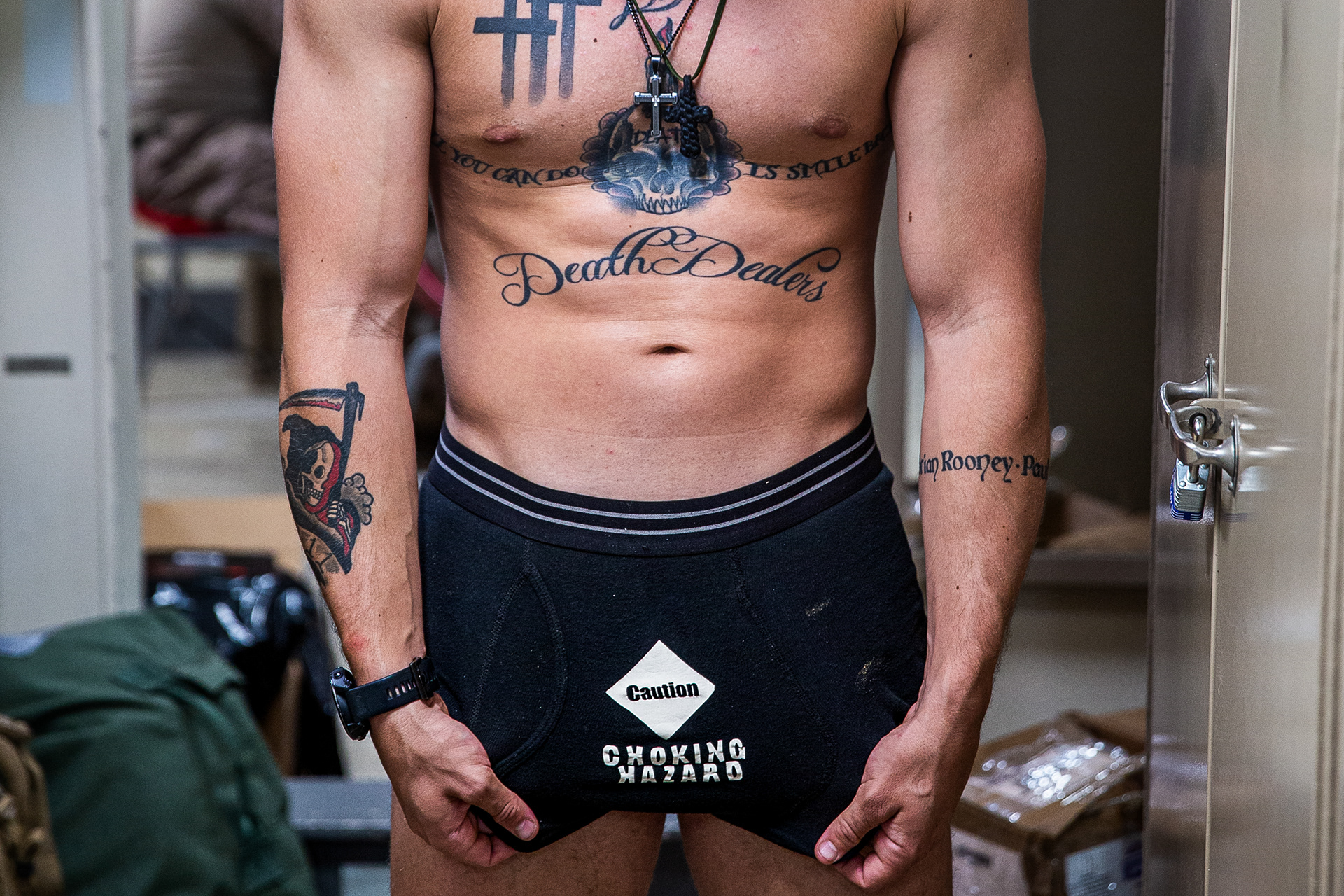 U.S. Marine Corps Sgt. Jonathan Rooney shows off his underwear aboard the USS Somerset (LPD 25) in the Red Sea on March 23, 2021. It is not uncommon for Marines living aboard a Navy ship to walk about their living spaces wearing little to no clothing.