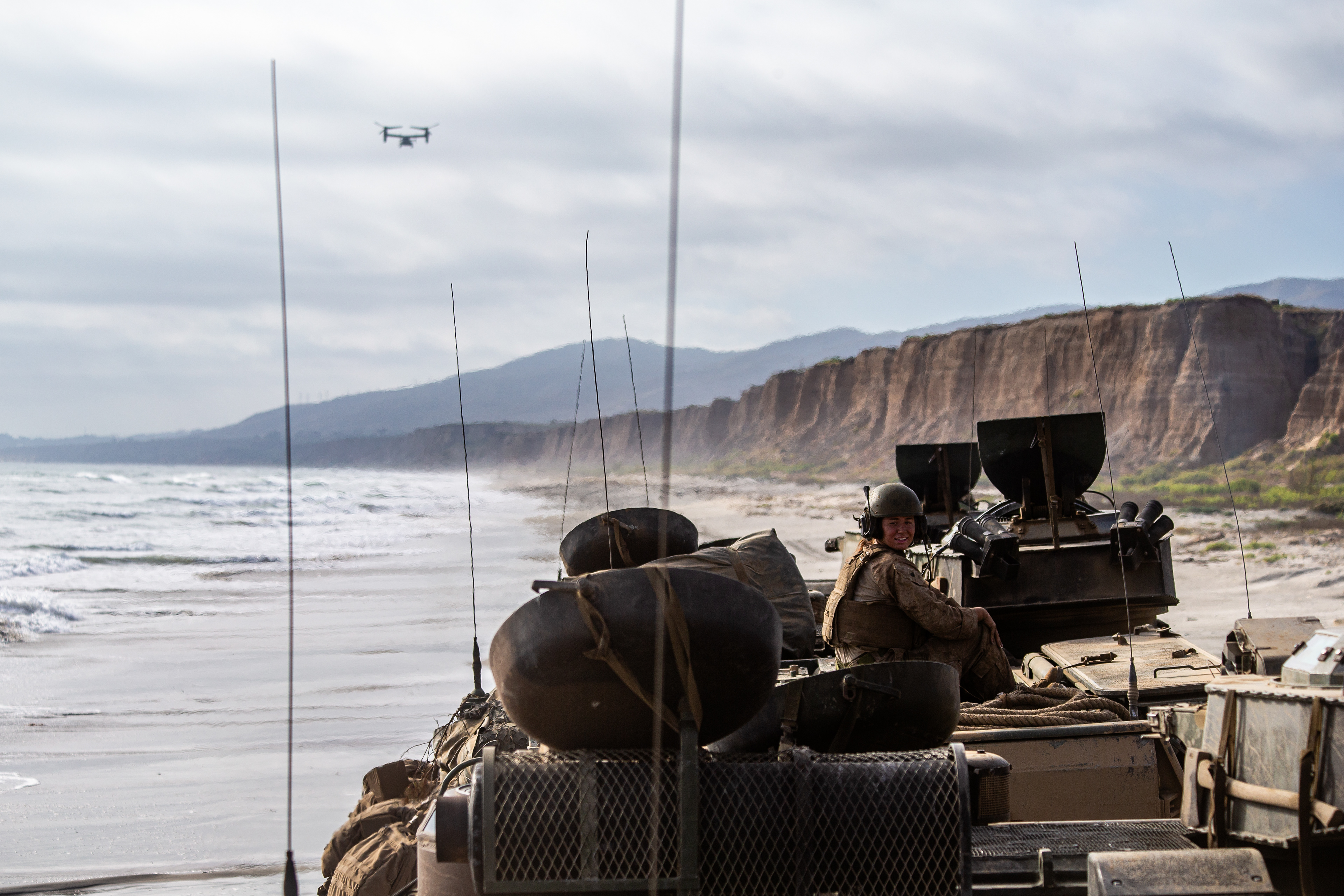 U.S. Marine Corps Cpl. Anika Garnette looks over a column of AAV-P7 assault amphibious vehicles as an MV-22 Osprey flies overhead on Red Beach at Marine Corps Base Camp Pendleton on July 14, 2020. The AAVs were the backbone of the Marine Corps' ship-to-shore capability for over 40 years until they were removed from waterborne service following the sinking of the pictured vehicle a few weeks later.