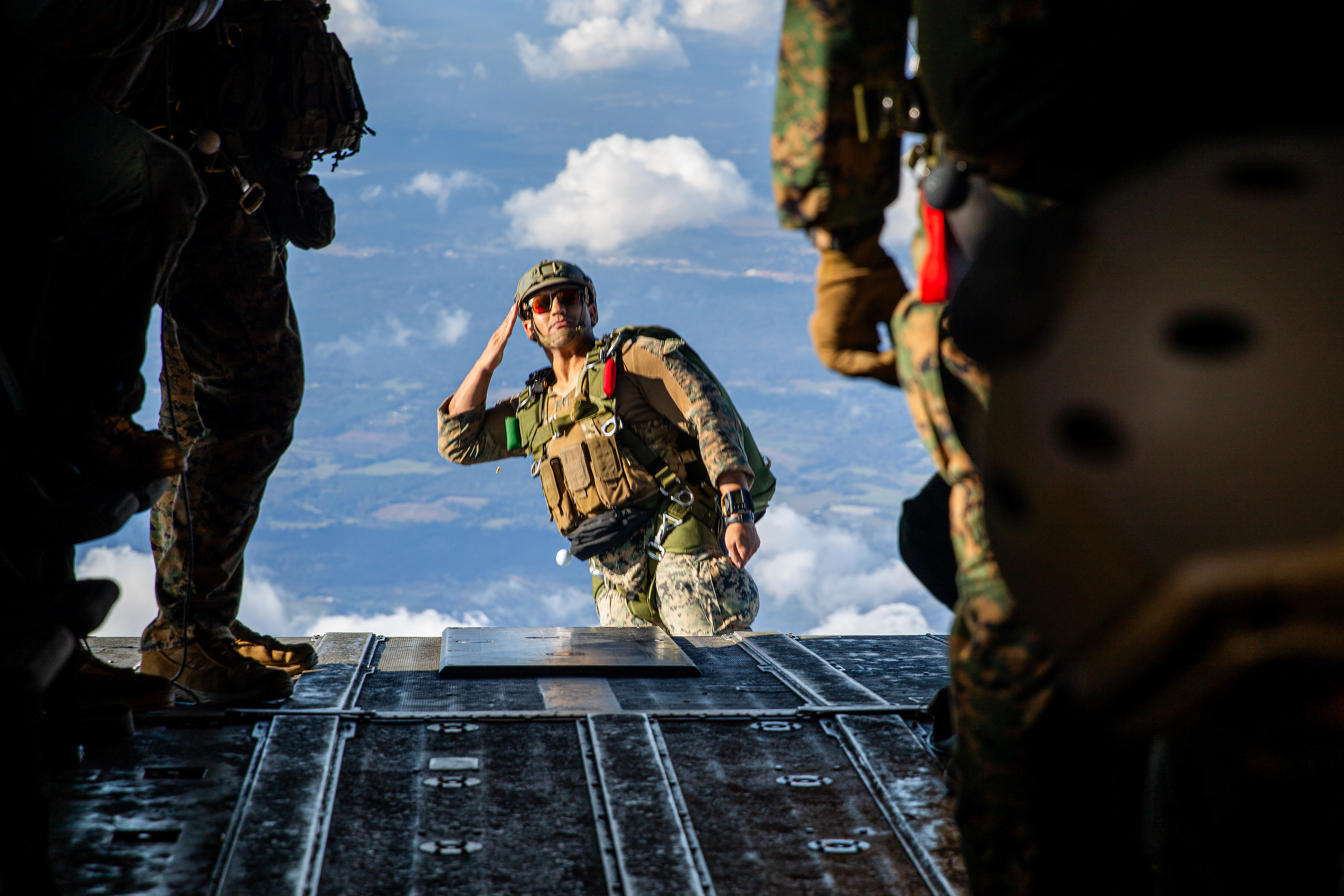 U.S. Marine Corps Staff Sgt. Andrew Rodriguez salutes as he jumps out of the back of a CH-53E Super Stallion helicopter over Hattiesburg, Mississippi on Oct. 25, 2021. Reconnaissance Marines like Rodriguez are required to maintain training qualifications for a myriad of disciplines including skydiving and scuba diving.