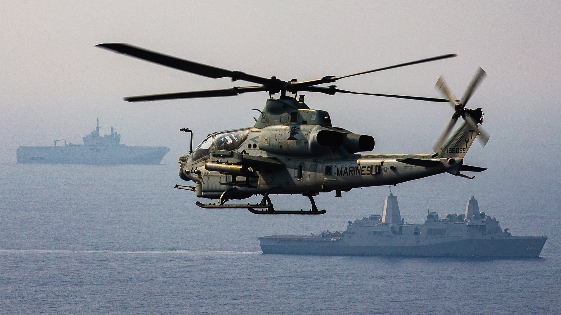 A U.S. Marine Corps AH-1Z Viper attack helicopter flies over the USS Somerset (LPD 25) and the FS Tonnerre (L9014) in the Bay of Bengal on April 7, 2021. The U.S. and French militaries routinely train together throughout the world.