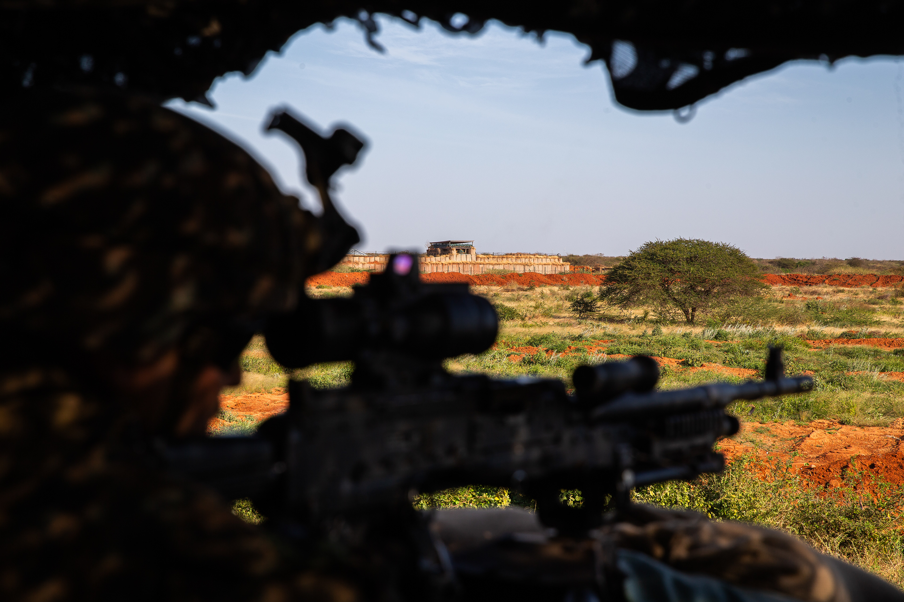 U.S. Marine Corps Lance Cpl. Andreu Mitchell looks through the sight of his M240B machine-gun while standing guard at Baledogle Military Airfield in Somalia on Jan. 8, 2021. Belt-fed and effective at ranges exceeding 1,000 meters, the M240 provides a reliable source of firepower for entrenched Marines.