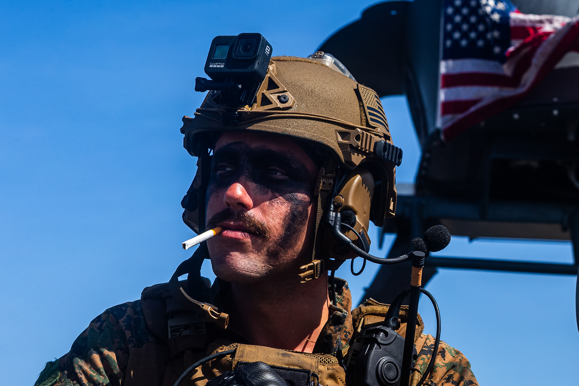 U.S. Marine Corps Sgt. Michael Turner readies a cigarette during a small-boat reconnaissance mission off the shore of Kissmayo, Somalia on Dec. 27, 2020. As the small boats were tossed about in the 10-foot waves, turner exclaimed, "Smoke em' if you got em'," signaling a tactical pause to the rest of the Marines.