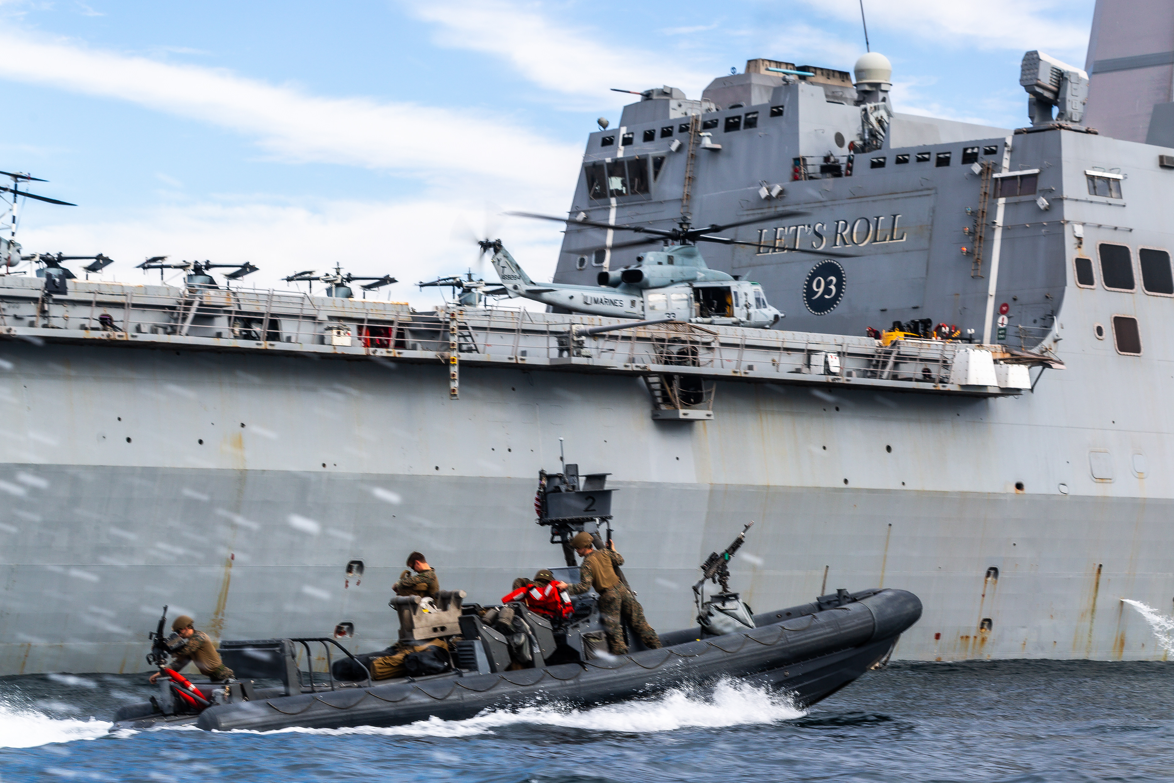 U.S. Marines in a small boat speed alongside USS Somerset (LPD 25) in the Pacific Ocean on Nov. 5, 2020. The Marine's Hymn famously boasts, "We fight our country's battles in the air, on land, and sea."